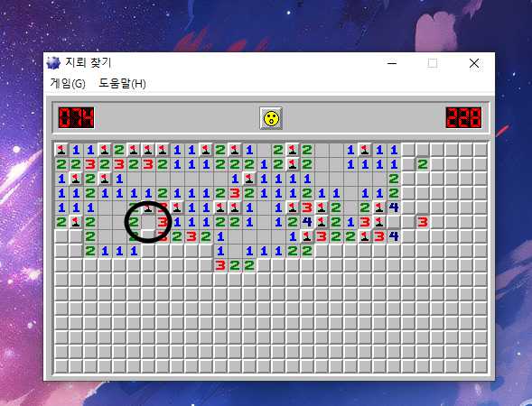 사진과 같은 경우에는 표시한 숫자3을 마우스 양쪽으로 클릭을 해주면 표시한 빈칸이 열리지 않고 들어가는 것을 알 수 있습니다. 저 숫자3은 이미 양쪽에 지뢰 표시가 되어 있기 때문에 저 빈칸이 지뢰라는 것을 알 수 있습니다.