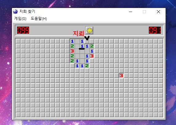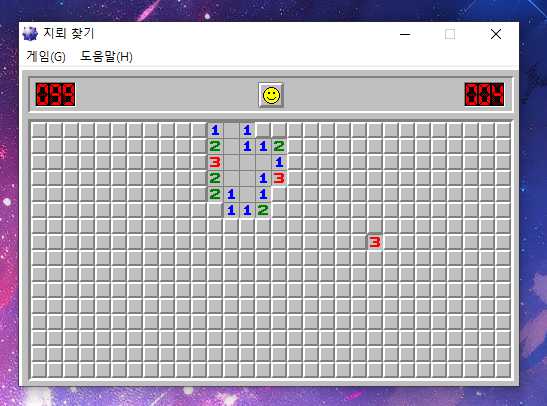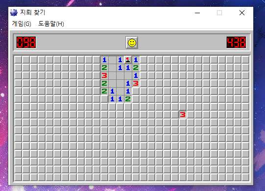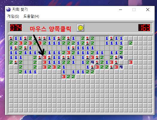 그러면 그 자리에 깃발을 표시해주고 그 아래에 숫자를 마우스 양쪽버튼으로 눌러주면 숫자칸이 열리게 됩니다.