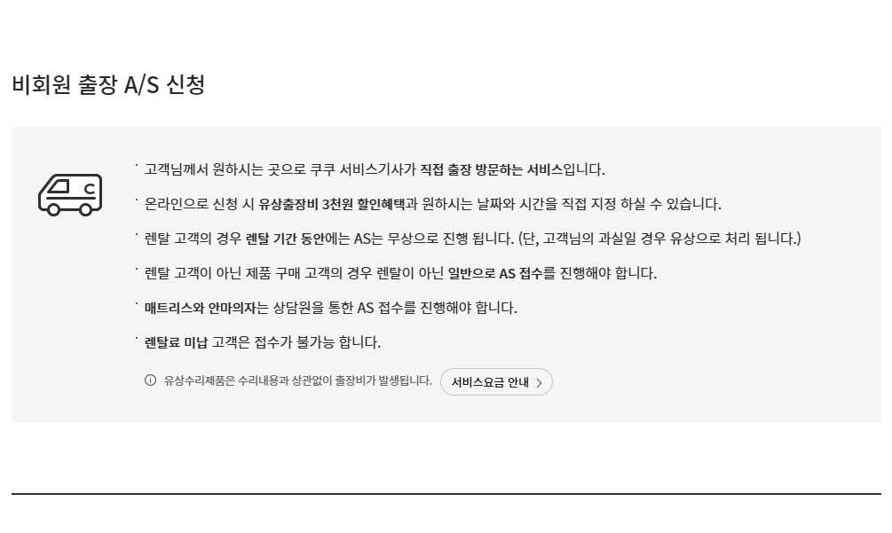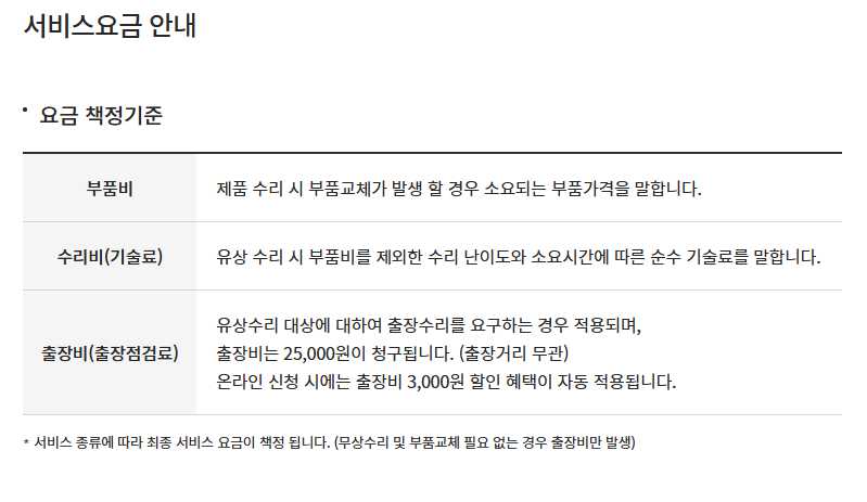 출장요금은 무상수리인 경우에는 출장비가 무료이고, 유상수리에 대한 건에는 위치나 지역에 상관없이 25,000원을 추가적으로 지불을 해야 하는데요, 제품이 상당히 무겁다던가, 시간이 없거나 거리가 좀 있는 경우에는 기름 값이나 본인의 시간을 생각하면 출장비를 지불하는게 더 효율적일 수가 있겠습니다.