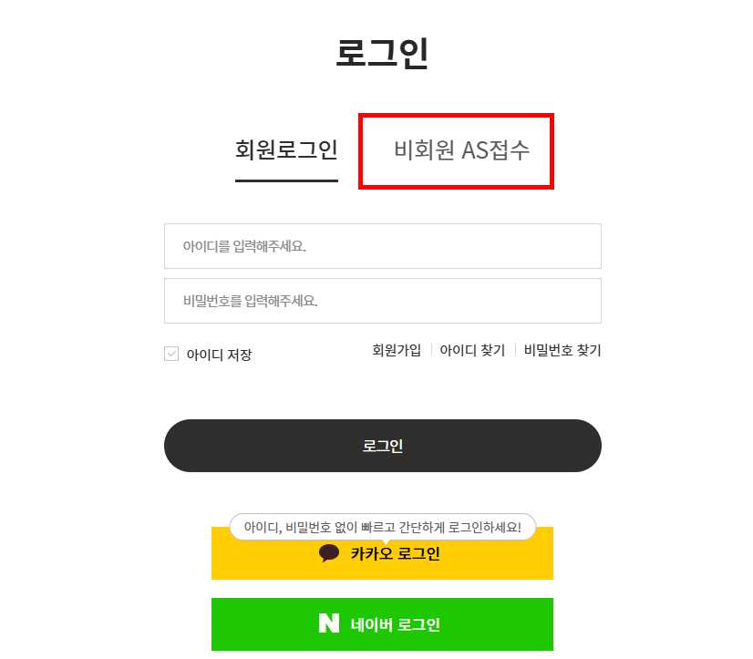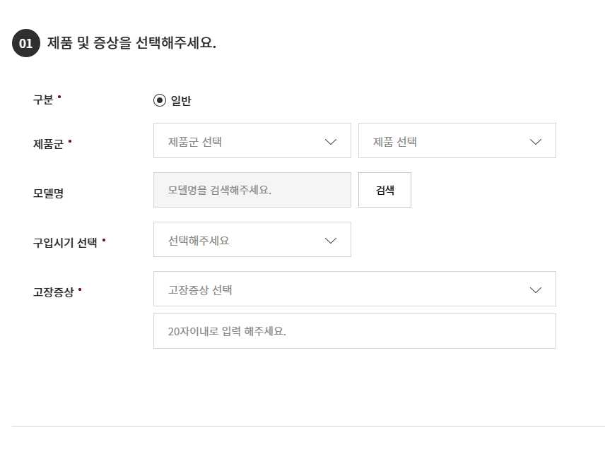 쿠쿠 AS 예약화면에서 비회원 AS접수를 선택하고 제품군, 모델명, 증상 등을 입력해줍니다.