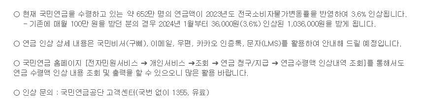 2024년의 국민연금 인상율을 먼저 확인해보자면, 2023년도의 물가변동률을 반영해서 3.6%가 인상이 되었습니다.