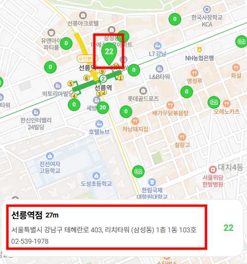7) 검색된 내용에서 재고가 있는 편의점을 누르면 좀 더 자세한 정보를 알 수 있습니다. 확실히 하고 싶으면 지점 전화번호를 확인하고 전화를 해서 예약을 하거나 확실하게 직접 확인을 할 수 있습니다.