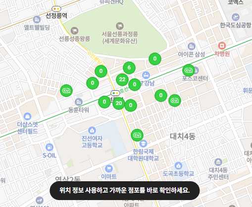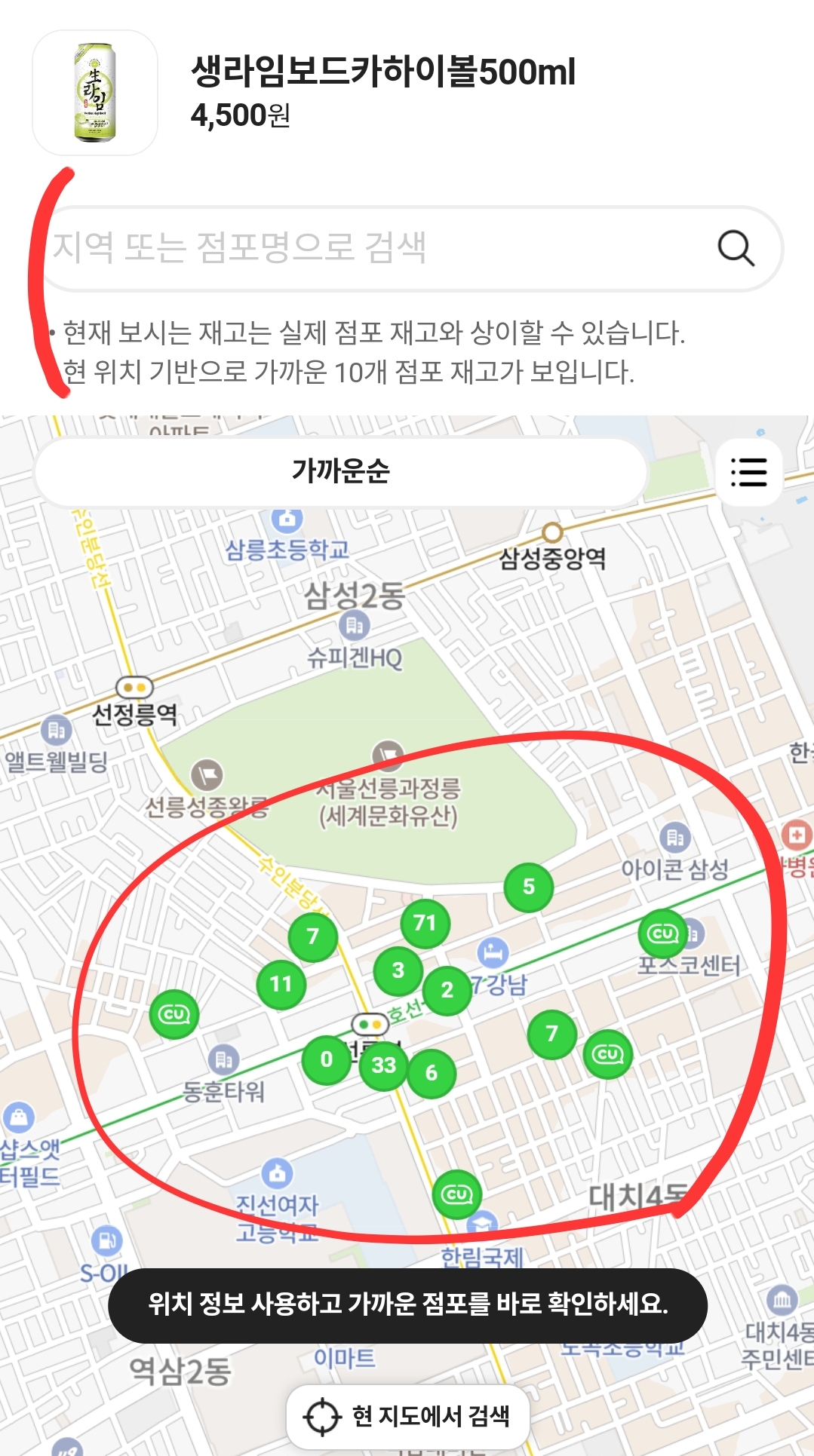 5) 위치 정보가 없더라도, 직접 지역이나 편의점 지점명을 입력하여서 검색할 수도 있구요.