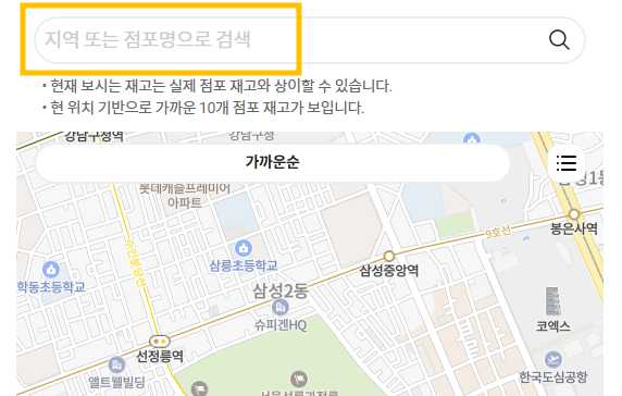 4) 바로 지도에서 주변 편의점이나 재고를 조회해볼 수 있고, 주소를 입력하여 검색을 할 수 있습니다.