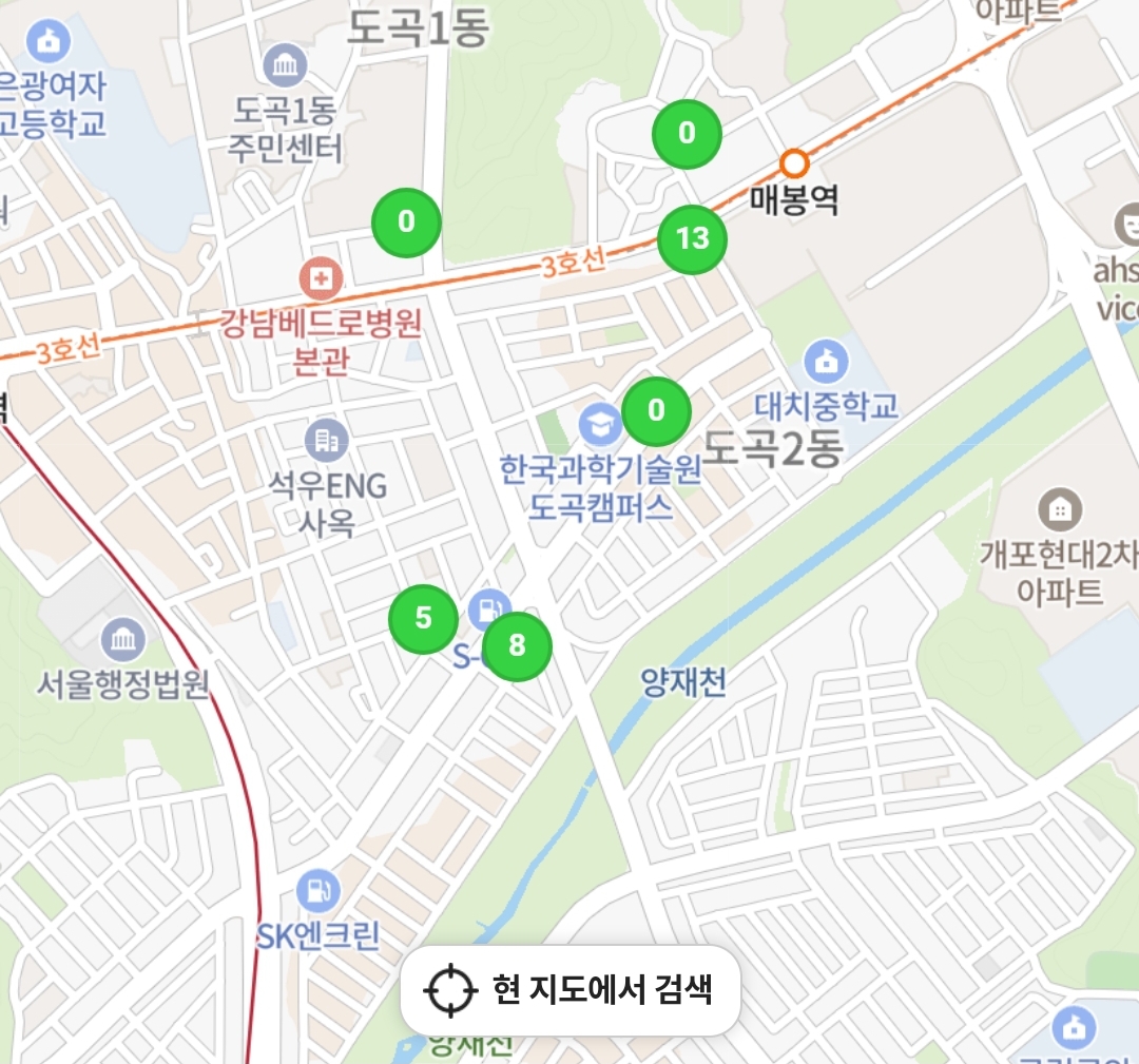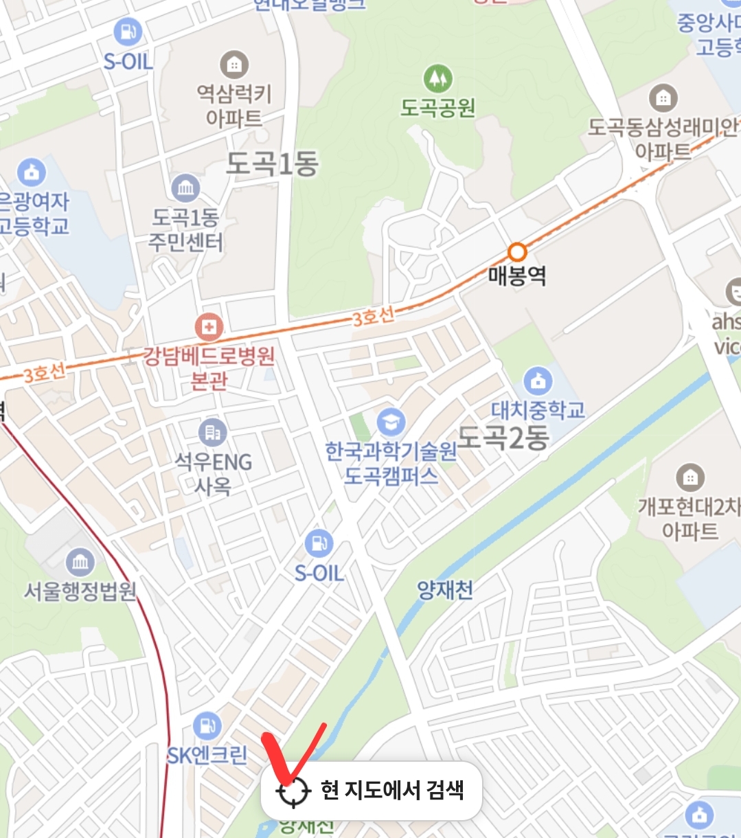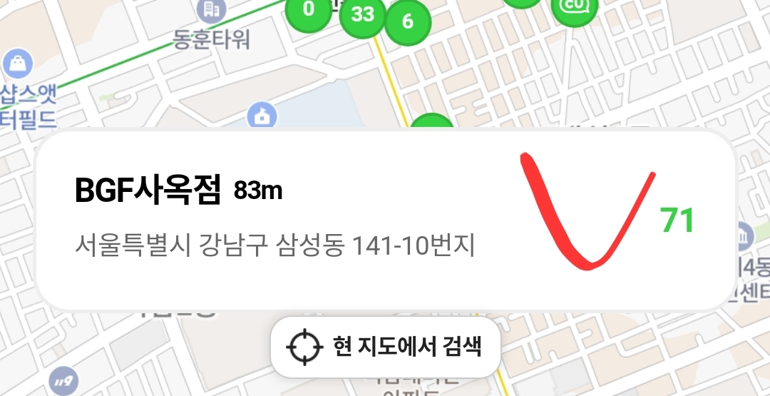 5) 만약 근처 편의점 모두 재고가 없다면, 지도를 돌아다니면서 근처에 다른 편의점들의 재고를 확인해볼 수 있습니다. 해당 지역으로 지도를 움직여서 아래 지도에서 검색을 눌러주면 됩니다.